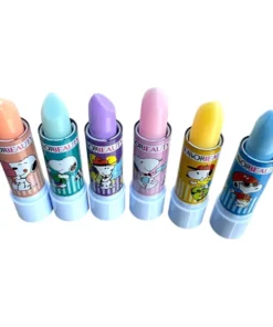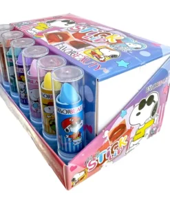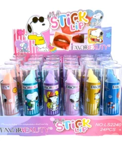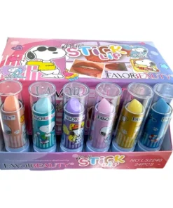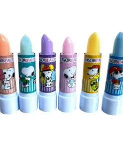 Caja de 24 lápices labiales con diseño de Snoopy. Colores surtidos y acabado semi-mate.