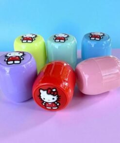 Caja de 24 bálsamos labiales con el icónico personaje Kitty. Aporta color y humectación a tus labios.